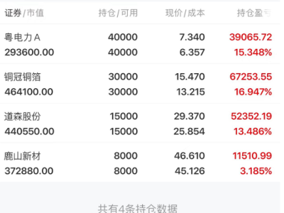 跟蹤華哥時間比較長的可以看出,或者更直接的來說,看華哥持倉就知道。華哥從6月以來一只堅持的根據市場特點,做新能源新技術低位起漲強勢股,追擊低位起漲的策略目前來看是比較成功的,雖然沒有說掙%五六十,但至少是不賠錢,還有賺的,且勝率高,只是部分新朋友不斷給華哥反映,銅箔現在不上不下的進也難受,不進更難受,光看這華哥喫透了,還好華哥今天復盤又發現一個方向出現低位起漲強勢股,而且這個方向周期屬性比較強,處於起漲初期朦朧階段,明天華哥早盤華哥會繼續公布股票名單和看好理由,大家多多點贊加關注不迷路。$粵電力A(SZ000539)$$銅冠銅箔(SZ301217)$$道森股份(SH603800)$