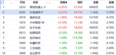 $港股通科技30ETF(SZ159636)$$比亞迪電子(HK|00285)$$小米集團-W(HK|01810)$