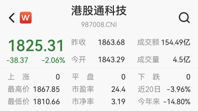 港股三大指數全天呈單邊下跌行情。截至收盤,恆指報18533.05,跌3.02%,國指報6268.53,跌3.47%,恆生科技指數報3948.82,跌1.69%。