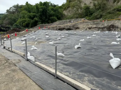 ▲位於霧峰山區的台中「燕圾湖」,先用防水布及沙包壓在表面。(圖/江和樹提供,2025.11.10)