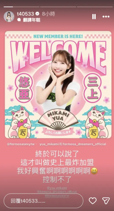 福爾摩沙夢想家今日正式公布三上悠亞加盟Formosa Sexy,為新賽季注入超強星光。梓梓隨後也興奮表示:「終於能公開,真的等太久!史上最炸加盟!」而三上悠亞本人則感性表示:「非常期待與台灣的球迷再次見面。去年來到夢想家主場時感受到滿滿的熱情,這次能正式加入 Formosa Sexy,我會努力展現最熱情的應援能量,與大家一起為夢想家加油」。