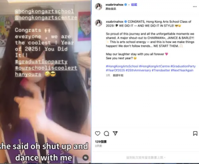 何超盈在IG上傳短片,興奮地向所有畢業生送上祝福:「CONGRATS, Hong Kong Arts School Class of 2025! WE DID IT — AND WE DID IT IN STYLE!」(恭喜,香港藝術學院2025年畢業生!我們做到了—而且我們做得非常出色又有風格!)影片裡何超盈完全拋開名媛包袱,與年輕的畢業生們一起歡呼、手舞足蹈,熱情且充滿朝氣,超級親切。