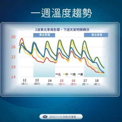 林得恩說,不過鳳凰颱風遠離後,2波東北季風也跟著報到,今天北台灣溫度下滑到20度,加上局部大雨未停歇,體感低溫感受特別明顯;接著下一波東北季風預計下週一南下,北部、東半部雨勢略增,且這波冷空氣會是入秋以來,降溫最明顯的一波。