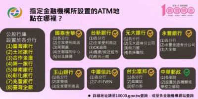 ▲普發現金1萬元11月17日開放ATM領現,16家指定金融機構設置ATM地點看這裡。(圖/金管會提供)