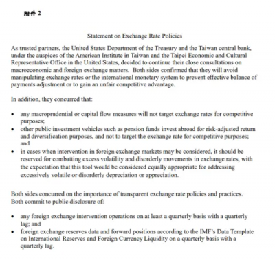 一、本行與美國財政部已就匯率議題達成共識,並於本(14)日台北時間晚間8時30分(同日美東時間上午7時30分)同步發布聯合聲明,中文版及英文版請分別詳見附件1及附件2。