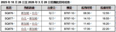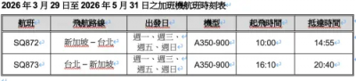 標題:為旅客提供更多夢想旅遊地!新航明年2到5月增加台北-新加坡航班