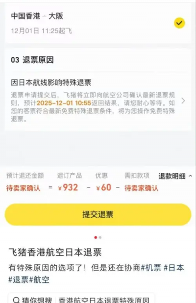 飛豬平台客服人員稱,只要涉日航線,均會在退票原因中顯示「因日本航線影響特殊退票」,但具體是否能退票成功取決於各家航空公司的規定。