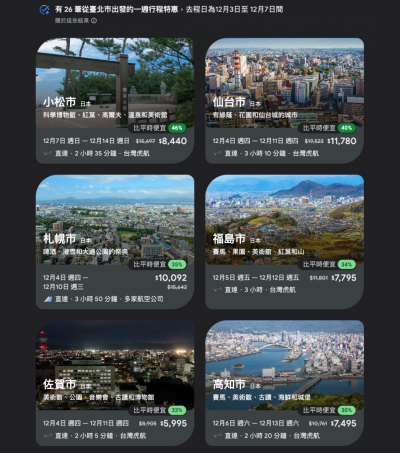 舉例來說,實測下達指令「想要找12月 3~7日之間,去日本最便宜的機票,以直飛為優先,最好是能晚上下班就出發的航班。」,就可以獲得多個城市的機票推薦,而且會提供「追蹤票價」的標示,告知哪一段航程比平均還要便宜,結果如下: