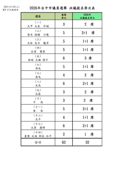 標題:迎戰2026!綠下屆台中市議員提名32席 這9選區新人還有空間