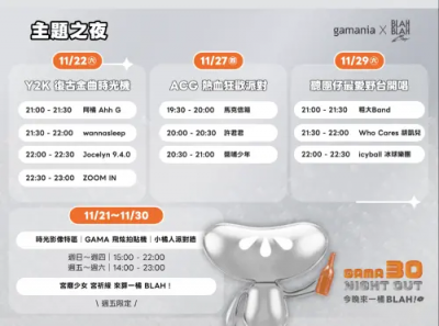 最後,J.Sheon不忘為「GAMA 30 NIGHT OUT 今晚來一橘 BLAH!」大力讚賞一番,分別於本月22、27、29日都在台北信義舉行不同主題的品牌之夜,從「Y2K 復古金曲時光機」、「ACG 熱血狂歡派對」到「聽團仔最愛野台開唱」,由他揭開序幕,接著讓粉絲穿越時空、盡情狂歡!