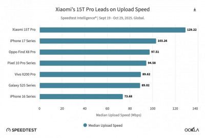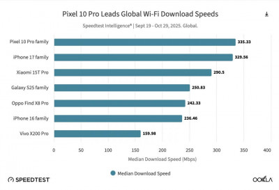 這份調查是Ookla統計今年9月19日至10月29日期間、全球Speedtest用戶的眾包資料而來。從中數位結果顯示,Google Pixel 10系列的全球Wi-Fi下載網速為335.33 Mbps,位居榜首,領先蘋果iPhone 17系列(329.56 Mbps)和三星S25系列(250.83 Mbps)。