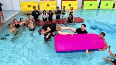 他們特地派出阿翔帶領藝人組應戰,遊戲開始之後,阿龐才剛爬上水上墊就直接撞上阿翔的鼻子,在接連幾次挑戰失敗之後,阿翔乾脆直接踩在水上墊,一個一個將藝人組給拉上來,在幾輪嘗試之後,藝人隊終於挑戰成功,得分206秒,胡瓜在旁看藝人組的表現,決定自己下場帶著佳沁一起挑戰看看,甚至揚言道:「我大概10秒就上去了。」