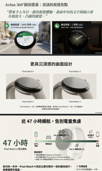 可以看到 NotebookLM 將原本長篇大論的開箱文章,Gemini 3 以簡略的文字將所有功能、特色製作成單一的簡報,而且會自動生成圖片、表格來搭配,整體圖文並茂十分精彩。實際閱讀內容,也都有將重點妥善提及,整體完成度相當高。不過仍可以發現,如充電座的部分是自行生成,與實際產品外觀不同,建議提供越多完整的圖片、文字來源,以提升 AI 簡報的精準度。