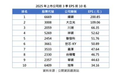 ▲2025年上市公司前3季EPS前10名。(圖/中華徵信所提供)