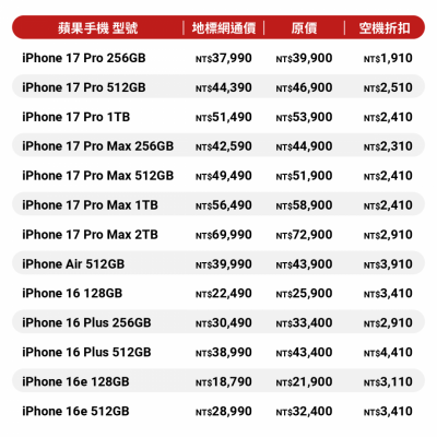 地標網網目前針對新一代 iPhone 17 系列、iPhone Air 推出最高 3,910 元的空機折扣,在台灣最搶手的 iPhone 17 Pro 256GB 目前只要 37,990 元,在蘋果今年新機價格強勢之下,已經比原價低了 1,910 元,高階款 iPhone 17 Pro Max 更是有最多 2,410 元的跌幅,最劃算的則是 iPhone Air,512GB 下殺至 39,990 元。