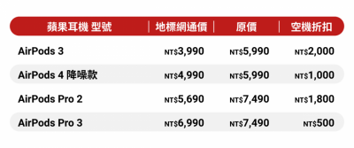 此外,最新上市的 AirPods Pro 3,地標網通也在開賣後,隨即提供 500 元的回饋價格,而基本款 AirPods 3 更是降價 2,000 元,現在能以 4,000 元有找的價格帶回家,相當於 67 折。