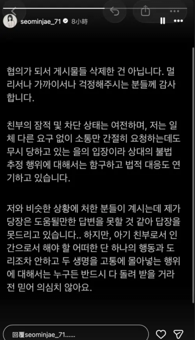 徐敏在先是解釋自己刪除貼文的原因,「不是因為和好才刪文,對方到現在都還在失聯中,我只是想要好好跟對方溝通,不過總是遭到對方無視」,表示自己誠心向跟對方好好溝通,甚至為次暫緩了提告的部分。