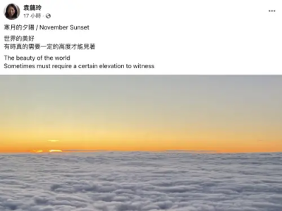 最近弟弟突如其來的病情變化,袁藹玲在臉書貼出一張疑似從高空或飛機上俯瞰的絕美夕陽雲海照片,並以中英文對照寫下:「寒月的夕陽 / November Sunset。世界的美好,有時真的需要一定的高度才能見著 / The beauty of the world SometiÅmes must require a certain elevation to witness。」