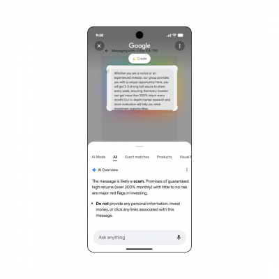 透過「畫圈搜尋」,用戶可輕鬆搜尋螢幕上看到的任何內容,包括可疑的詐騙資訊。這項功能結合來自網路的資訊與AI摘要(AI Overview),協助判斷內容是否可能涉及詐騙,並提供相關指引與建議步驟。整個過程不需要切換應用程式或中斷目前的瀏覽體驗,就能直接辨識潛在風險。