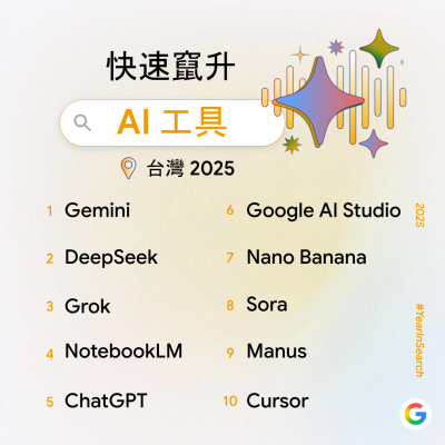 今年 Google 可以說是 AI 界的大贏家,統計在 Google 搜尋關鍵字裡「快速竄升 AI 工具」10 大榜單,其中有 4 款都是來自於 Google 自家的產品,像是第一名 Gemini 今年就躍升冠軍,更是所有關鍵字排行的第五名,其次還有 AI 筆記工具 NotebookLM,以及圖像生成的 Nano Banana 與開發使用的 Google AI Studio,說明其 AI 產品的多元性。