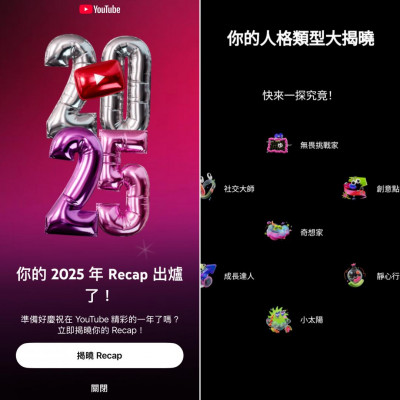 YouTube Recap年度回顧有趣的地方在於,它不只統整你最常觀看的影片主題、追蹤最多的頻道,還會根據你的觀看習慣做個性化分析,像是奇遇追尋者、冒險王或小太陽等人格類型,讓人看了會心一笑。