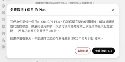 實際操作也相當簡單,只要是ChatGPT Plus訂閱用戶,現在進行取消訂閱流程時,系統就會跳出「免費再送一個月」的通知提示,代表這個月不會被取消,並從下個月才會重新開始收費,等於多賺一個月的Plus使用時間。