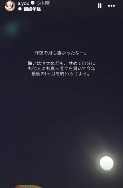濱崎步今日下午在IG限時動態發文,分享一張月亮照,心中似乎感觸極深,她用日文寫道:「昨晚的月亮也好漂亮啊。遺憾雖然無法抹去,但至少要對自己、對他人都保持坦率,把今年最後這1個月好好結束吧。」濱崎步雖語氣溫柔,但似乎是在回應被中國造謠的事件,希望大家都能保持誠實。
