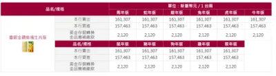 我是廣告 請繼續往下閱讀 台銀委託中央造幣廠鑄造金鑽條塊馬年生肖版今日正式開賣。金條正面標示該行及中央造幣廠的標章及中英文名稱、重量(1台兩37.5 g)、含金成色(Fine Gold 999.9)及條號。主題圖案「一馬當先」描繪一匹英姿颯爽駿馬,快步奔馳於滿佈幸運草的曠野,象徵勇往直前及好運綿延不絕的祝福,更寓意得天獨厚、馬到成功,希冀新的一年能藉駿馬縱橫馳騁之勢,迎來「一馬當先、成功躍進」的嶄新篇章。