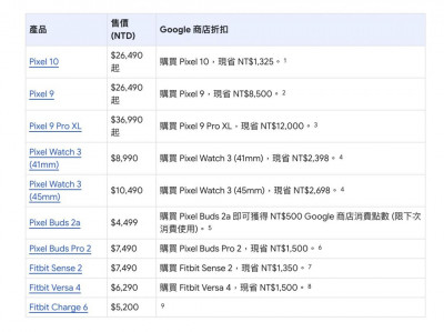這次降價幅度方面,Pixel 10下殺1,325元,優惠價25,165元起;Pixel 9與Pixel 9 Pro XL則分別降了 8,500元、12,000元,最新價格調整為17,990元、27,990元起。