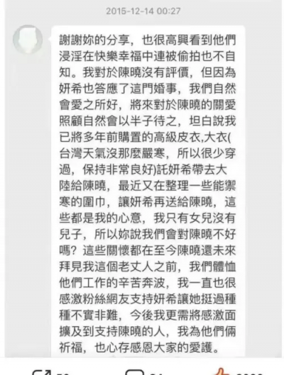 陳爸爸也說自己一生沒有兒子只有女兒,「所以妳說我們會對陳曉不好嗎?這些關懷,都在至今陳曉還未來拜見我這個老丈人之前。我們體恤他們工作的辛苦奔波,我一直也很感激粉絲網友支持妍希,讓她挺過種種不實非難;今後我更需將感激面擴及到支持陳曉的人。」