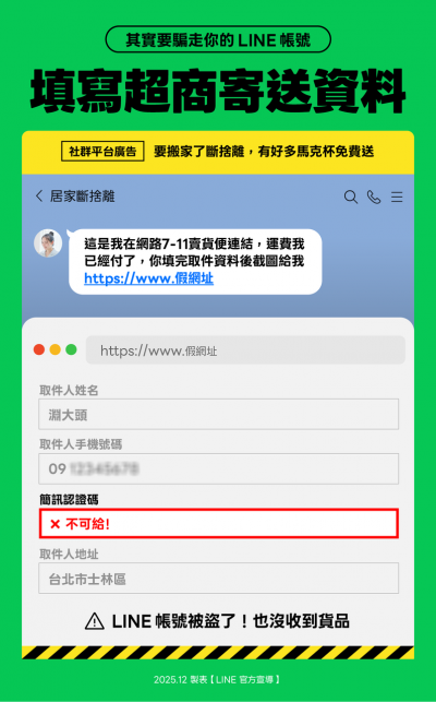 填寫超商寄送資料是常見的LINE盜取帳號手法。(圖/LINE)