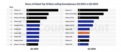 2025年第三季TOP 10暢銷手機。(圖/Counterpoint)
