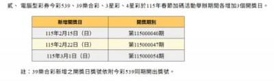 另外,今年農曆年加碼的還有每5分鐘開獎一次的「BINGO BINGO賓果賓果」連續20天獎金加碼,今彩539、39樂合彩、49樂合彩、3星彩、4星彩也都有加碼。