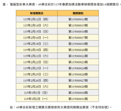 標題:迎金馬年!台彩春節加碼搶先曝光 大樂透連續19天開獎