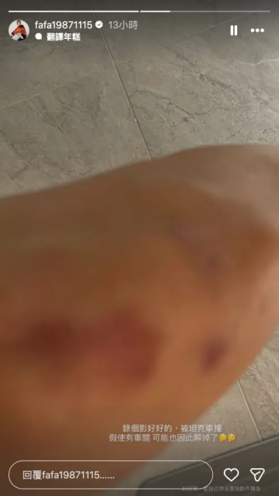豆花妹昨日在IG發文,自曝遭坦克車撞,同時曝光大片瘀青照,表示:「錄個影片好好的,被坦克車撞,假使有車關,可能也因此解掉了,好好笑,當自己洪金寶慢動作護身。」受傷的照片曝光後,引起許多粉絲擔心。稍早經紀人回應《NOWNEWS今日新聞》,表示節目遊戲中本來就是會有些小意外,當下被孟哲哥這個坦克車撞飛後,沒有驚嚇就是覺得好笑。