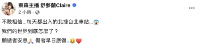 東森主播舒夢蘭在臉書發文表示,不敢相信,每天都出入的台北捷運,發生如此慘劇,她感嘆:「我們的世界到底怎麼了?」並為受害者祈福,寫下:「願逝者安息,傷者早日康復。」