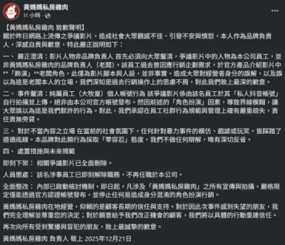 黃媽媽私房雞肉強調,本次事件是員工個人帳號行為,該爭議影片由該名員工在私人抖音帳號自行拍攝並上傳,絕非由本公司官方帳號發布,但因前述的「角色扮演」因素,導致界線模糊,讓大眾誤以為是店家默許行為,「我們承認在員工社群行為規範與管理上確有嚴重疏失,責任責無旁貸」。