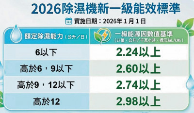 隨著節能意識擡頭,政府對家電能效的要求越來越嚴格,自2026年1月1日起,除濕機將全面採用最新的能效分級標準,之後市售的新款除濕機將更省電,尤其是一級能效的產品,省電更「有感」。如果家中的除濕機已服役多年,不妨趁著新制上路汰舊換新,不只能減少電費支出,長期使用起來也更安全安心。