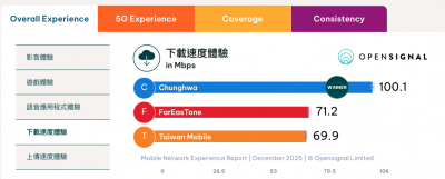 研調機構 Opensignal 今日公布台灣最新的,收集了 8 月至 10 月 29 日三大電信於各項目服務的網速表現。中華電信成為最大贏家,橫掃 16 座獎項裡的 13 個項目,更在下載、上傳速度明顯領先。