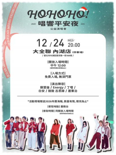我是廣告 請繼續往下閱讀 《HOHOHO!唱響平安夜》公益演唱會由相信音樂主辦,與全聯、大全聯以及全聯佩樺圓夢社會福利基金會合作,在明(24)日於大全聯內湖店溫暖登場,活動自晚間8點00分開始,中午12點起開放民眾入場。現場不僅有10米高巨型聖誕樹打造夢幻雪景,周邊同步規劃好喫好逛的聖誕市集,讓民眾感受滿滿的節日氛圍。