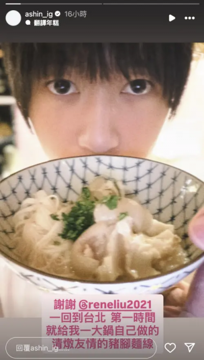 阿信現已返台,他在社群平台曬出一碗熱騰騰的豬腳麵線照片。他表示,一回台就有人煮了一大鍋清燉豬腳麵線給他喫,很感謝。在台灣習俗中,喫豬腳麵線有「去黴運、壓驚」的含意,師姐特製的麵線,額外溫暖。