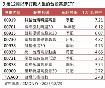 標題:9檔高股息ETF表現超越大盤 法人持續看好金融股明年表現