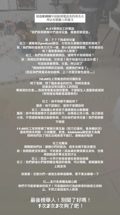 陳彥婷更提到震驚全國的虐童事件「剴剴案」,表示剴剴遭受虐待跡象明顯,社工卻未發現,而自己認真育兒卻反被調查,讓她感到十分荒謬。最後陳彥婷更向惡意檢舉人喊話:「1次2次3次夠了吧!別鬧了!」