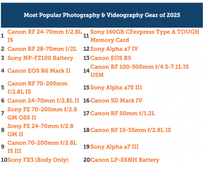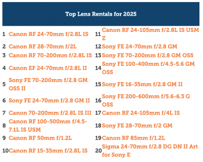 美國知名攝影器材租借網站 近日公開 2025 年平台的租借數據,揭露專業用戶最愛的攝影器材品牌,Canon 再度稱霸,而 Sony 持續聚焦在錄影市場。