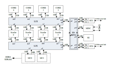 Godson-3B1500 的互連設置。在每個四核集群內,高層結構看起來非常相似。