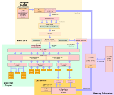 然而,它比英特爾的 Haswell 架構及其後繼者落後一步,後者可以在同一周期內進行兩次加載和一次存儲。當前一代 AMD 和英特爾的 CPU 也有大規模擴展的內存執行能力。例如,Golden Cove 可以在每個周期進行兩次加載和兩次存儲。Zen 4 每個周期可以進行三次內存操作,其中兩次可以是存儲。當龍芯开發 GS464E 時,考慮到英特爾的 Ivy Bridge,雙 AGU 的設置似乎完全沒有問題。但時代在進步,現在看來已經相當過時了。