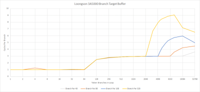 如果分支腳印從 64 個條目的 BTB 中溢出,CPU 必須等待分支從 L1i 中被取走,然後計算目標地址。在這一點上,所採取的分支延遲基本上是 L1i 延遲,這在 LA464 上似乎是三個周期。作爲比較,最近的英特爾和 AMD 的 CPU 即使在交出數千個分支時也只有一到兩個周期的延遲。這種延遲尤其令人痛苦,因爲 3A5000 的時鐘比 AMD 或英特爾的芯片低得多,所以實際時間的分支延遲相當高。