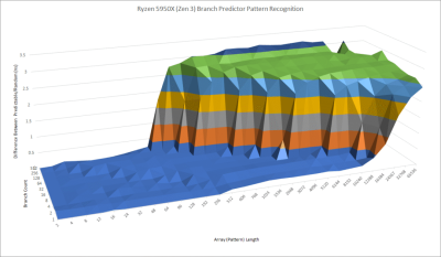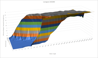 LA464 可能使用了一個類似的預測器。如果我們測試分支預測器在越來越長的隨機模式下的表現如何,龍芯的表現平平。它遠遠達不到目前英特爾和 AMD 的 CPU 的能力。最近的英特爾和 AMD CPU 使用了 TAGE(Tagged Geometric History Branch Predictor,標籤化幾何歷史分支預測器) 或感知器預測器,它們可以用更少的預測器存儲量達到更高的准確性。