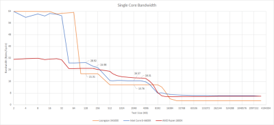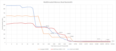 無論情況如何,AMD 和英特爾都有明顯的 L3 帶寬優勢。Zen 1 和 Skylake 都可以從 L3 每周期拉出更多的字節,而它們的高時鐘速度使龍芯更加落後。龍芯確實有容量上的優勢,但在面對 AMD 和英特爾的更多現代芯片時,這種優勢消失了。