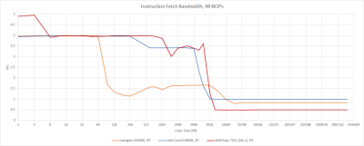 然而,看起來大的 L1i 是爲了緩解龍芯在從 L2 和其他地方獲取代碼時的不良性能。Zen 1 和 Skylake 在從 L2 提取指令時都能維持 4 的 IPC,即使他們不得不從 L3 運行代碼,仍然表現得非常好。龍芯無法與之相提並論,對於較大的代碼足跡來說,可能會被前端帶寬所限制。
